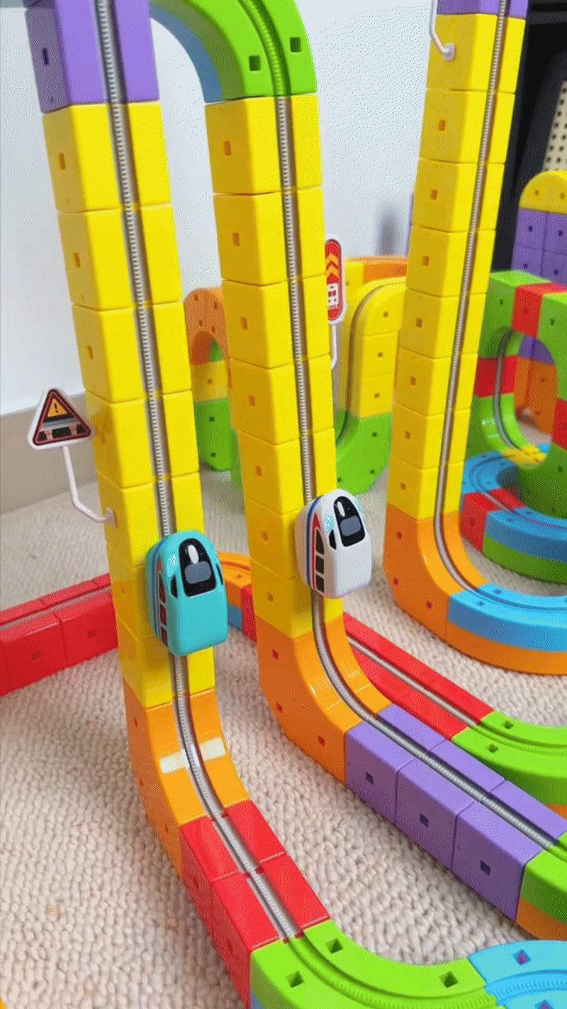 Yes! The motorized train is designed for gravity-defying play. It can climb uphill, race downhill, drive sideways, and even run upside down in 360° loops.